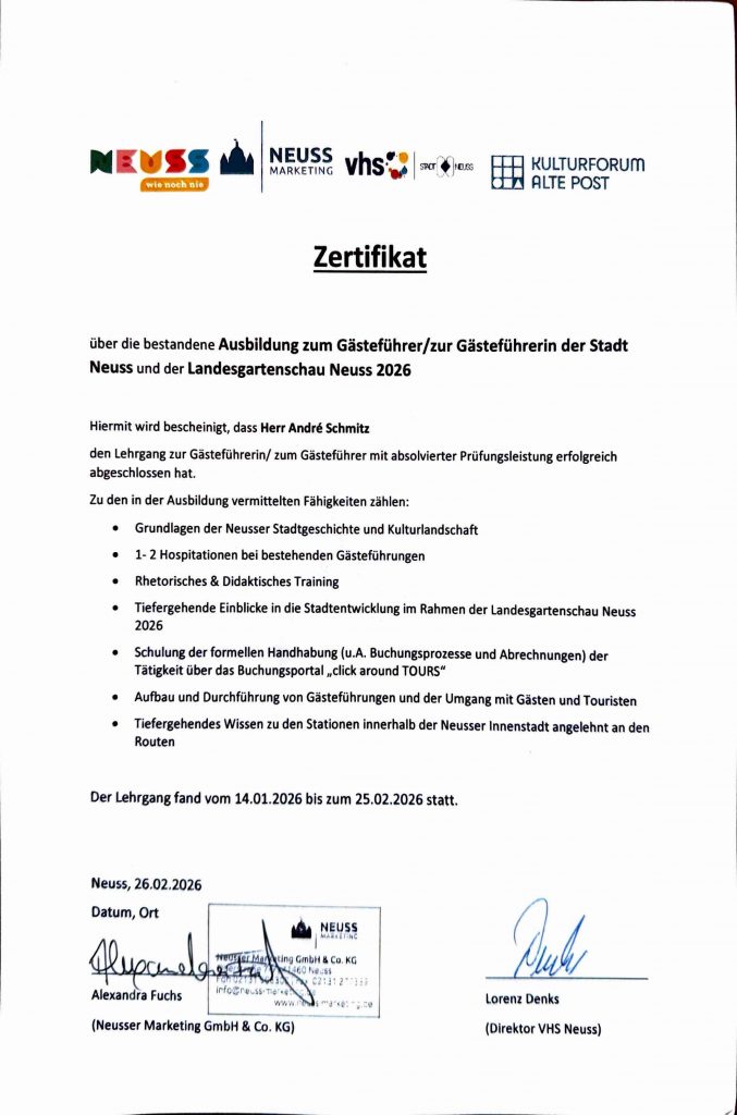 Home über mich Kontakt Termine öffentliche Rundgänge Kosten Bücher und mehr Videos europäische Nachtwächter- und Türmerzunft Presse Kommentare Impressum Datenschutz-Grundverordnung Über mich… Als ausgebildeter und zertifizierter pädagogischer Kirchenführer bin ich Mitglied im Bundesverband der Gästeführer in Deutschland und im AK Gästeführer Niederrhein